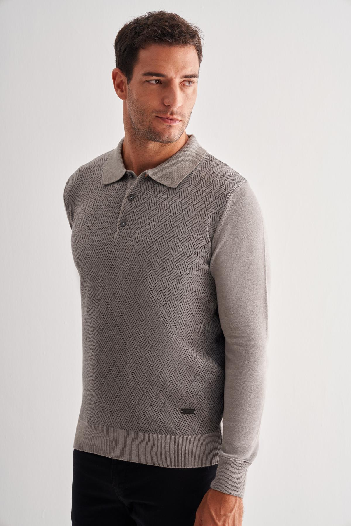 Açık Gri Polo Yaka Uzun Kol Cepsiz Comfort Fit Pamuklu Triko Kazak 1012255218 (1012255218_106)