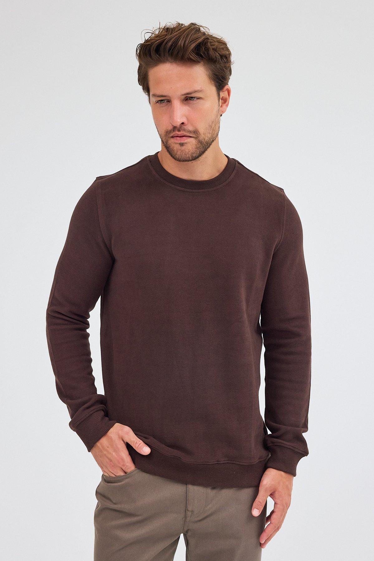 Kahverengi Uzun Kol Bisiklet Yaka Düz Pamuklu Comfort Fit Sweatshirt 1013255150 (1013255150_400)