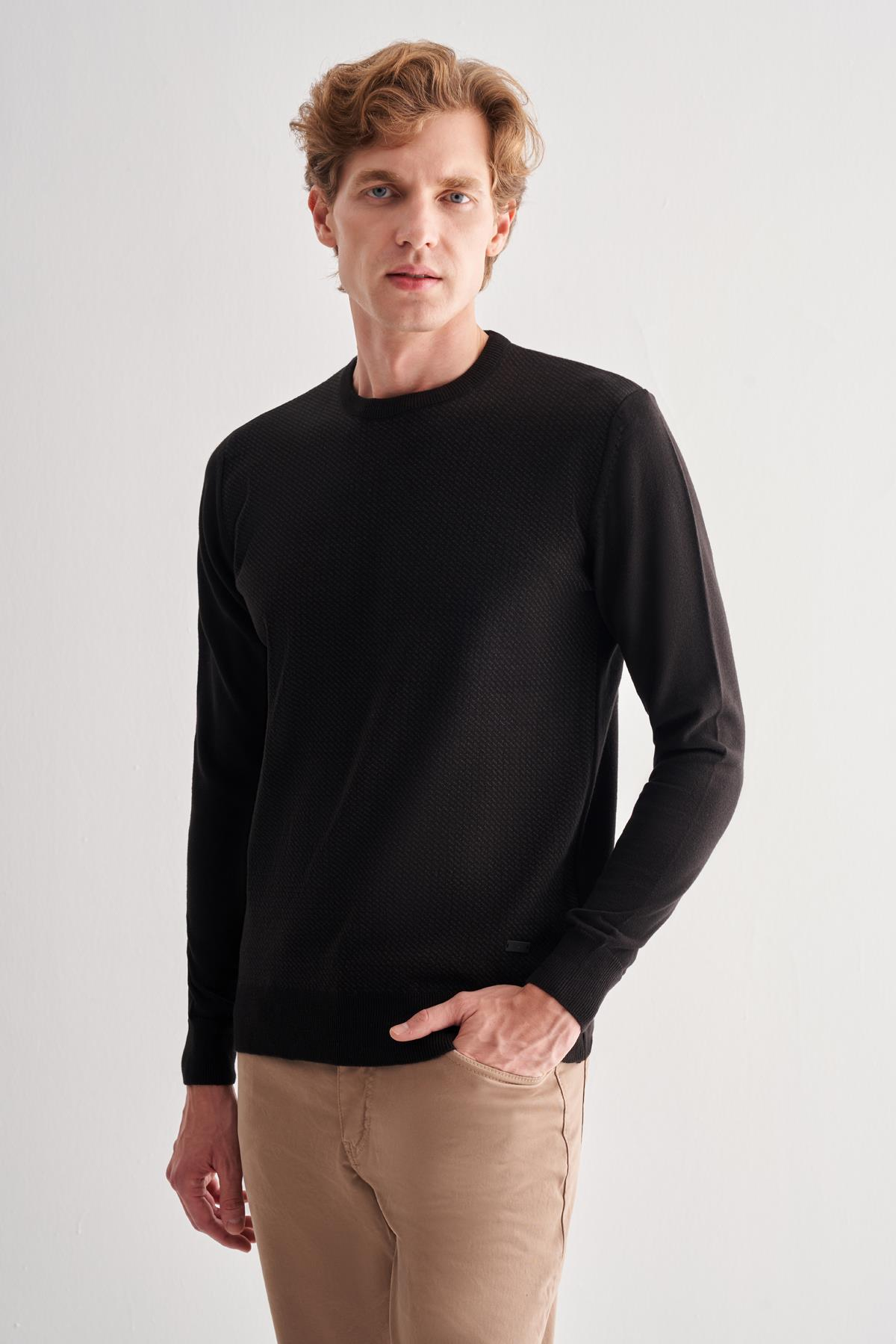 Siyah Bisiklet Yaka Uzun Kol Cepsiz Comfort Fit Pamuklu Triko Kazak 1012255220 (1012255220_001)