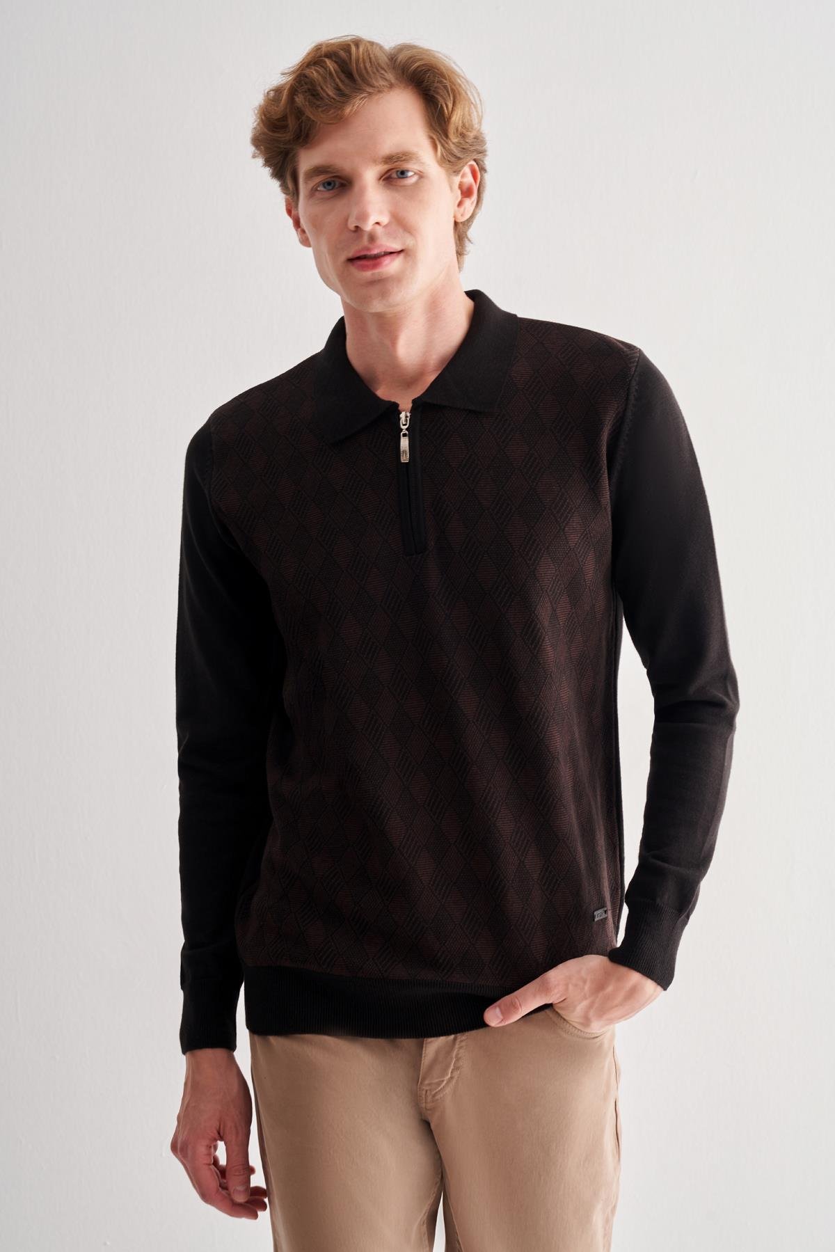 Siyah Fermuarlı Polo Yaka Uzun Kol Cepsiz Comfort Fit Pamuklu Triko Kazak 1012255223 (1012255223_001)